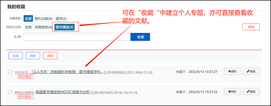 用户对不同类型的文献进行收藏后,资源可自行分类保存到“个人中心”,可随时进行查看、浏览、原文获取。