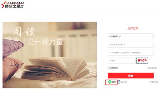 浏览器访问网址直接阅读使用:http://www.cxstar.com/sdcjdx.htm(IP范围内可以免登陆使用),点击微信登陆,使用已认证过的微信扫描二维码即可登陆。